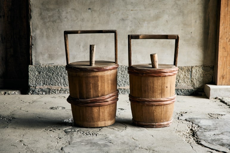 暖気樽(だきだる)は杉材で作られています。この樽は、中に熱湯を入れて酒母の入ったタンクに投入し、酵母を増やすために使用される道具です。