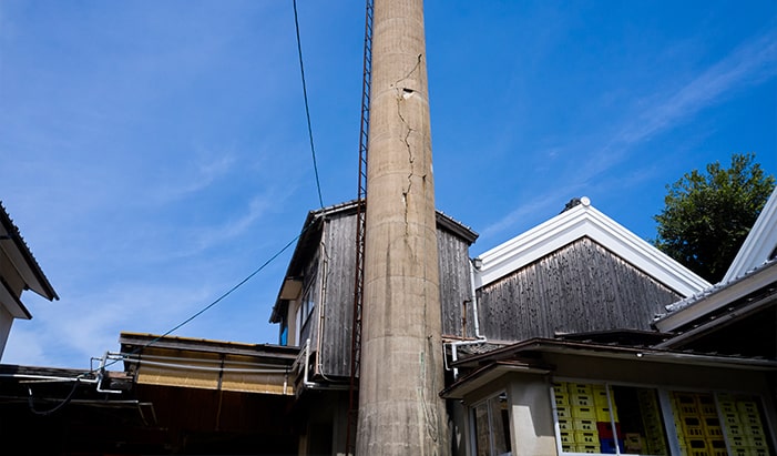 煙突頂部には柱頭飾りとして2段のつばの下に珠状突起、櫛状溝、横帯を施しています。煙突北側には管理用の鉄製はしご、南側には避雷針の先端痕と導線、留め具が取り付いています。