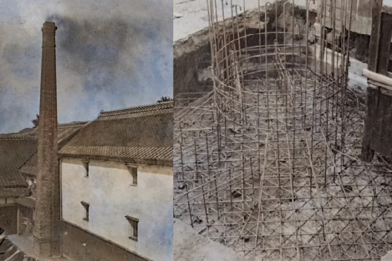 米を蒸す際やその他の作業で焚かれた石炭の煙を排出するために作られたものです。レンガ造の煙突(左側はカラー化加工された当時の写真)は、創業当初に建てられましたが、昭和5年の台風で倒壊しました。