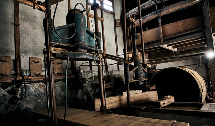 昭和初期頃からは、油圧ポンプで機械的に圧力をかけ、醪を搾り出す方法に変わり、平成14年まで、豊村酒蔵の酒づくりを支え続けてきました。
