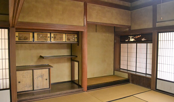 主座敷の床は畳床とし、床柱はスギの絞り丸太、床框は黒漆塗としています。床脇には天袋と棚、地袋を備え、地板はケヤキの1枚板を用いています。付書院は柳障子を建て、透彫の欄間を入れ、全体を透漆仕上げとしています。これは当家で最も格の高い座敷です。大工は吉村重兵衛です。