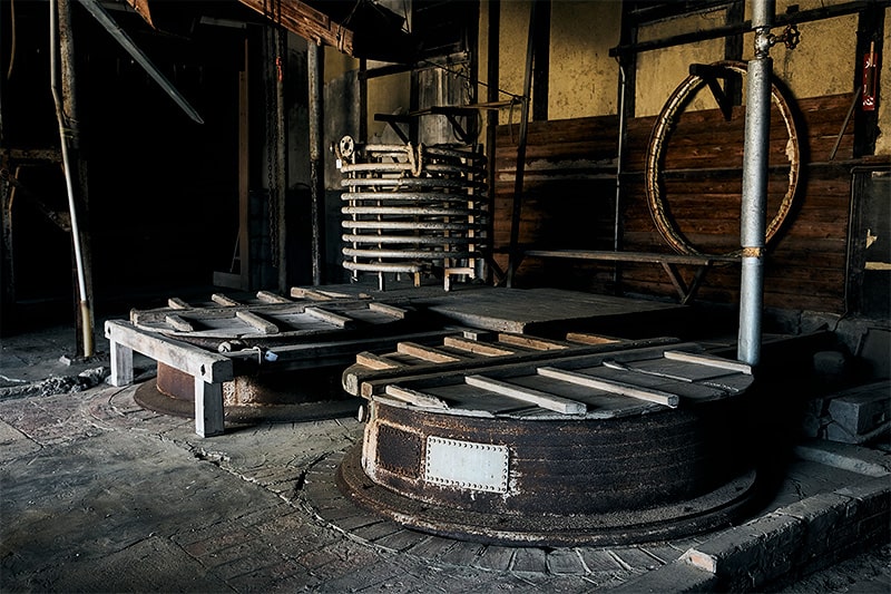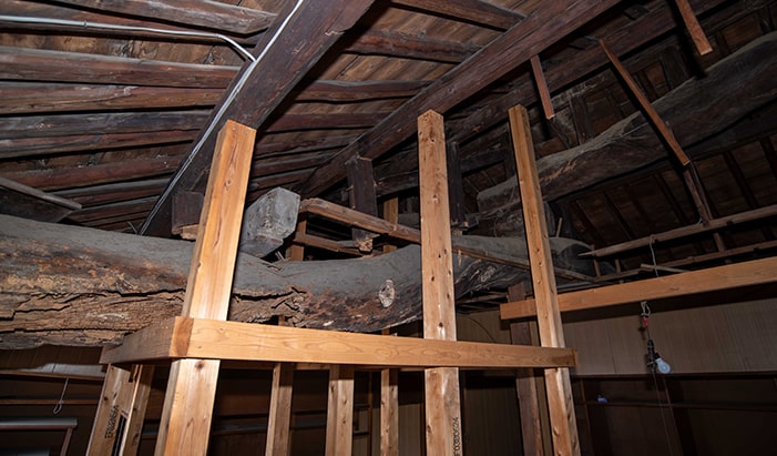使い込まれた車軸中心部分は、すり減って丸みを帯びています。酒造では一般的に使用されていたようですが、現存するものは少なくとても貴重です。(左は釜場の2階天井に設置され、右は一部の木材が欠けていますが、室(むろ)前の天井に置かれています。)