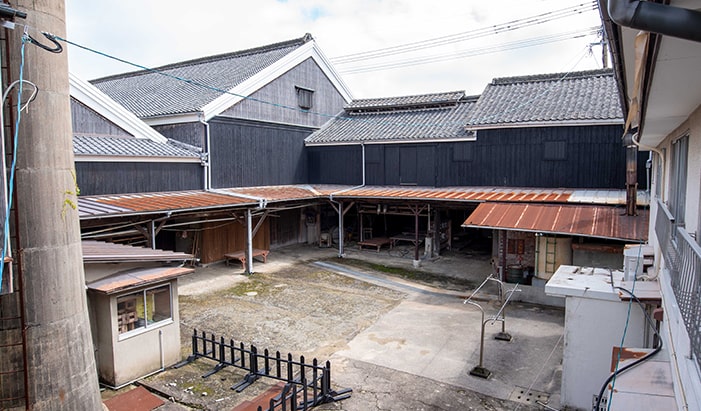 これは醸造後の酒を仮置きまたは貯蔵していた建物で、北面及び南面に間仕切りを設けていません。建築面積は173.28m2で、2階建、切妻造、桟瓦葺です。東面に金属板葺の庇を付け、桶干場としています。