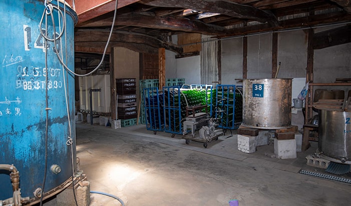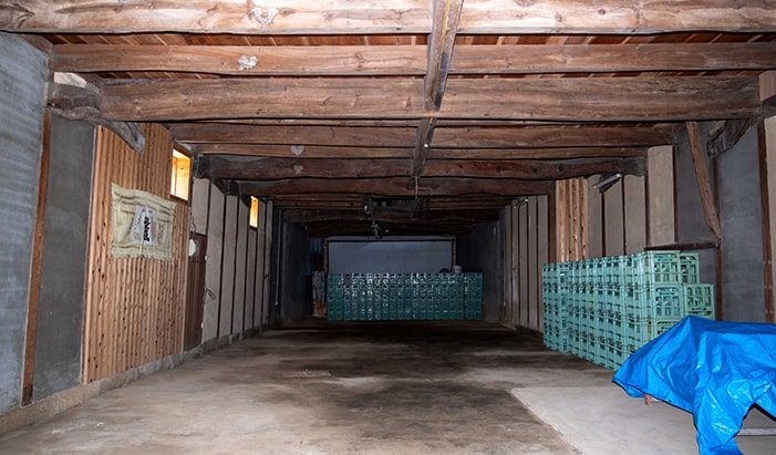 古酒倉(南)の東面と古酒倉(北)の西面北半分の間には間仕切りを設けず、1室となっており、西面に出入口があります。外壁が波板鉄板張である以外は、仕上げなどは麹室と同じです。
