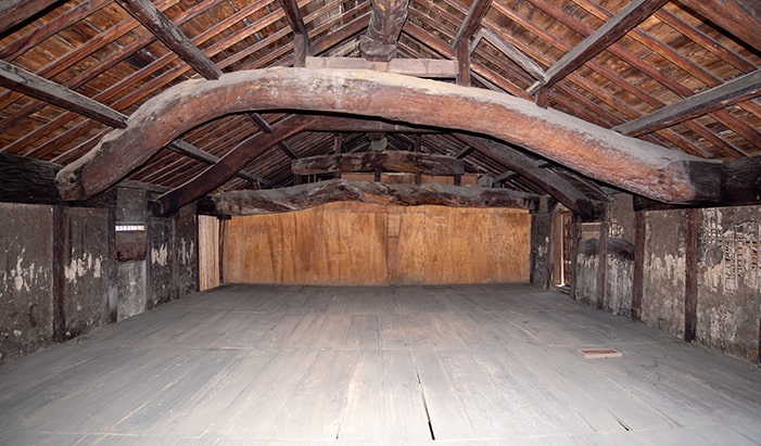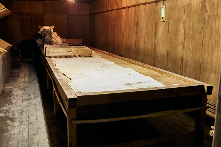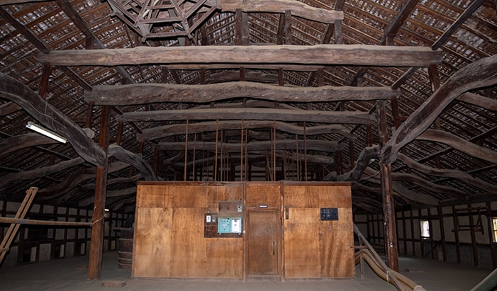 東面と南面の腰壁は切石積とし、小屋組には3重梁を架けています。内部は白漆喰塗に腰板壁としていますが、それ以外の仕上げは酒蔵と同様です。