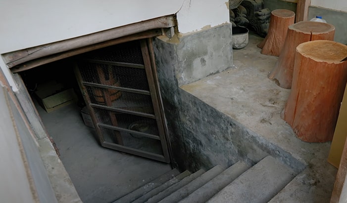 地下室は煉瓦造とし、その上に土蔵を建てています。小屋組は和小屋で、外壁は白漆喰塗に腰壁を海鼠壁としています。内部は各階1室となっており、北面に出入口を開いて石段を付しています。その西隣の下屋内部に地下への階段を設けています。