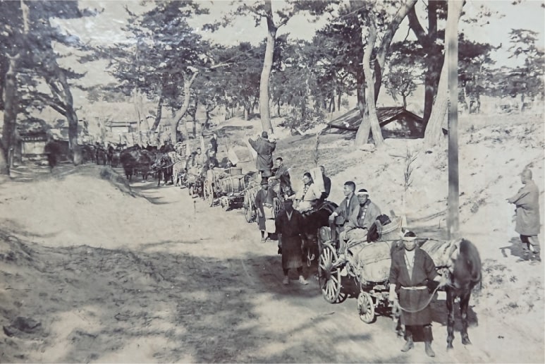 明治から大正期の風景と思われます。馬に引かせた荷車に米俵を積み、人夫たちが長い列を作って運んでいました。